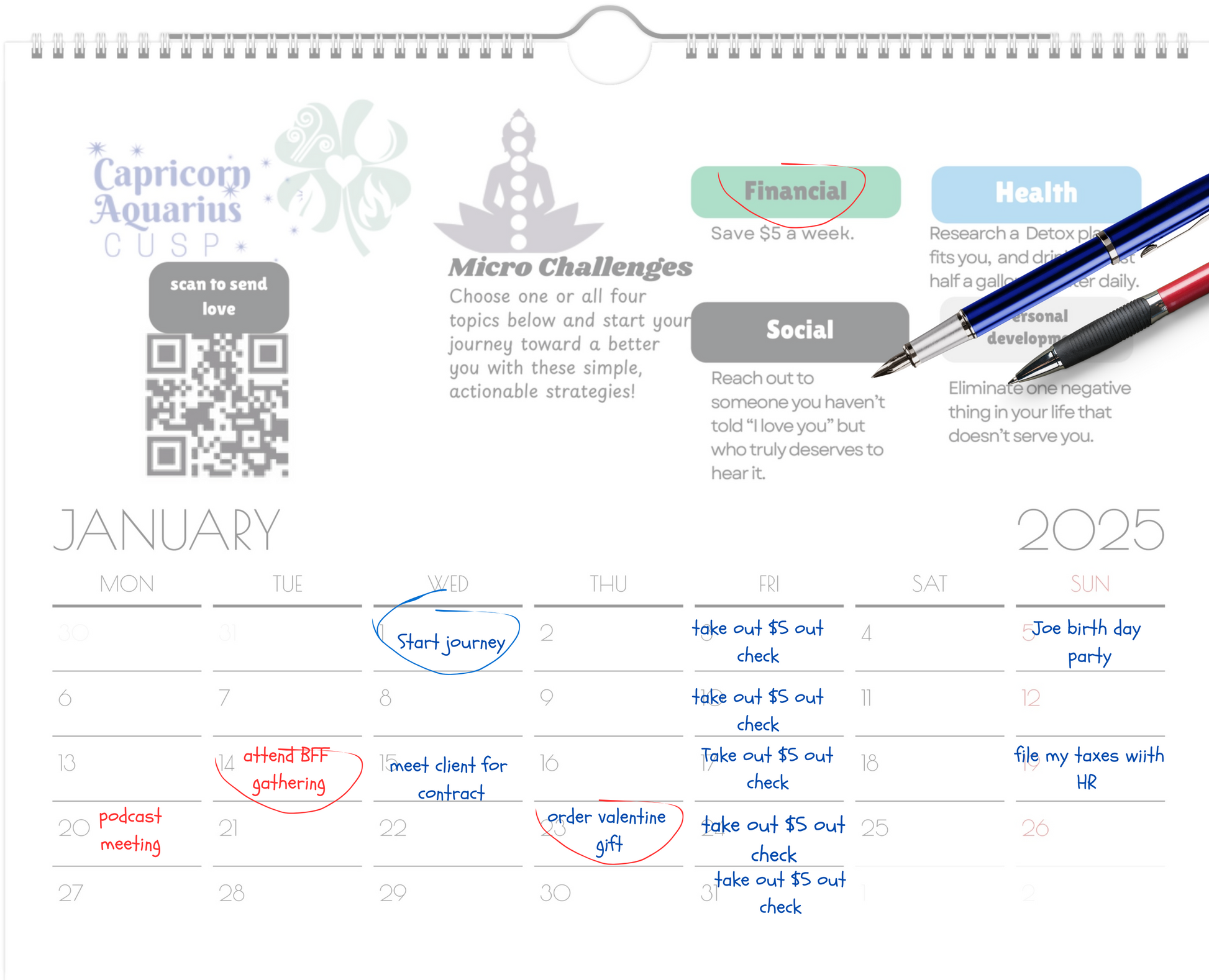 The Discipline Bagg write on Journal-Calendar is designed to keep you organized, motivated, and fully immersed in your self-improvement journey. Each month features tailored micro-challenges that seamlessly integrate with your essential products, such as the Brick Piggy Bank for financial growth, the tumbler pouch for hydration on the go, and the Ni card for effortless networking. With prompts for savings, wellness, and meaningful connections, the calendar transforms everyday routines into purposeful actions. Seasonal messages and reflective moments encourage mindfulness and gratitude, fostering a positive mindset throughout the year. By aligning your goals with essential tools and engaging in community participation, this journal-calendar makes progress achievable while reinforcing your commitment to growth
